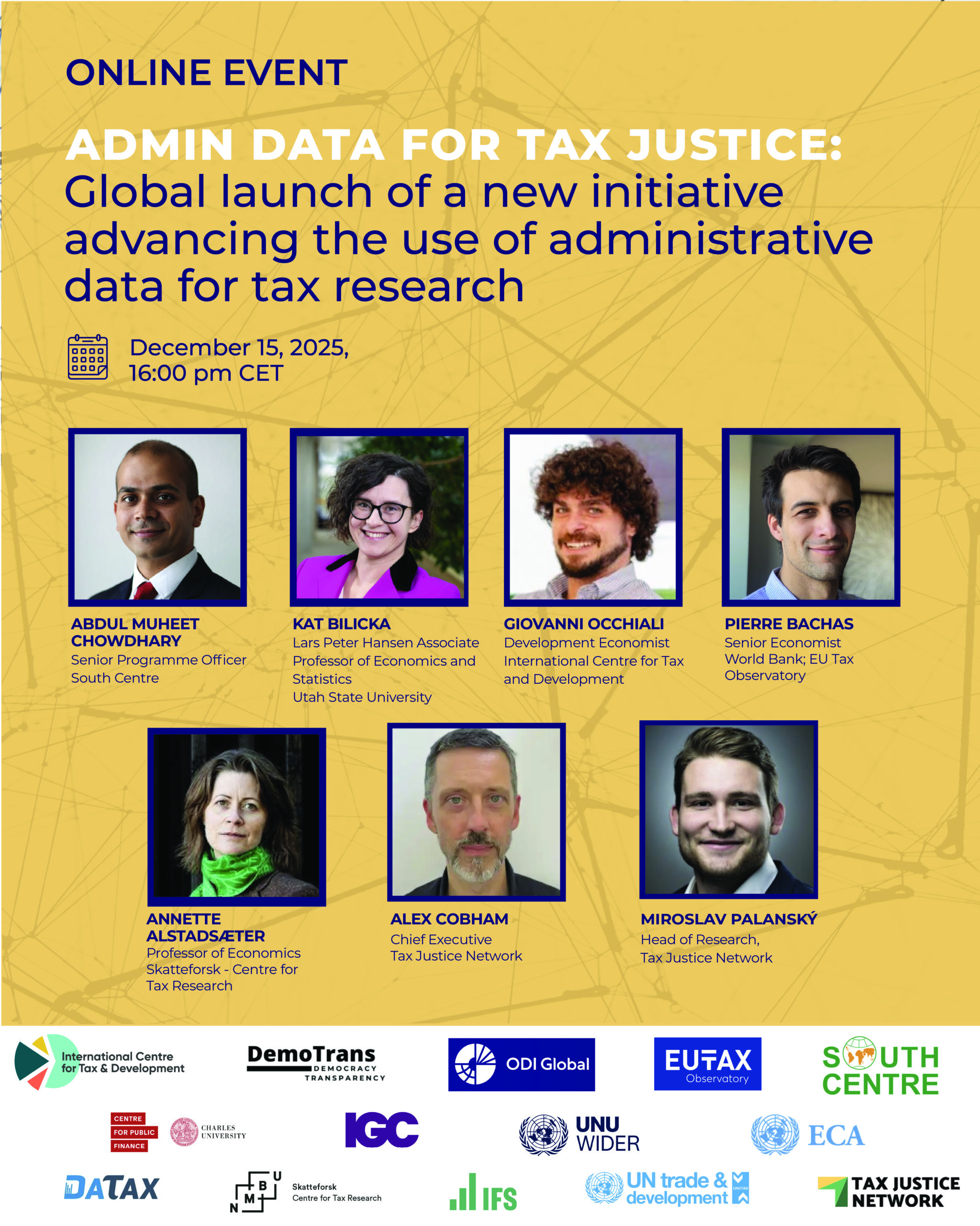 The virtual launch event will open with Miroslav Palanský (Head of Research, Tax Justice Network, and Assistant Professor of Economics, Charles University, Prague), who will launch the database, explain its structure, and outline how it supports the broader goals of the Admin Data for Tax Justice initiative. This will be followed by a high-level panel, moderated by Alex Cobham (Chief Executive, Tax Justice Network) and featuring Annette Alstadsæter (Professor of Economics, Skatteforsk – Centre for Tax Research, Norwegian University of Life Sciences), Pierre Bachas (Senior Economist, World Bank and EU Tax Observatory), Kat Bilicka (Lars Peter Hansen Associate Professor of Economics and Statistics, Utah State University), Abdul Muheet Chowdhary (Senior Programme Officer, South Centre), and Giovanni Occhiali (Development Economist, International Centre for Tax and Development). The discussion will examine the analytical potential of administrative microdata, lessons from successful data-access models, and the institutional conditions required for secure, ethical, and long-term data use. Panellists will also reflect on how better data infrastructures can transform research on tax avoidance, compliance, inequality, and public-sector capacity.