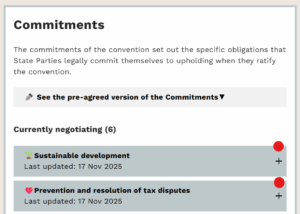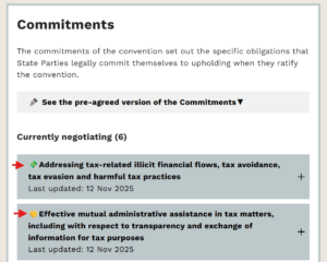We’ve added two updates summarising negotiations on the commitment on addressing illicit financial flows and commitment on effective mutual administrative assistance. You can find these updates in the Commitments area of the “Build-a-convention” section below.